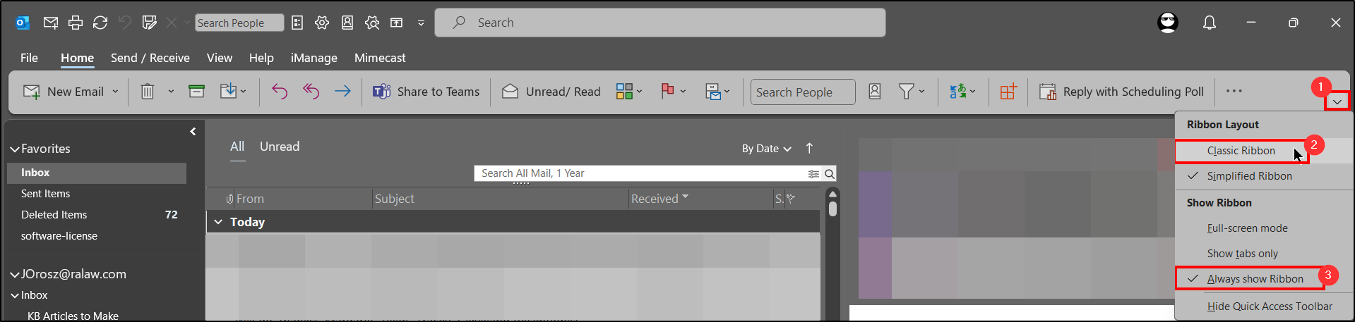 - The Ribbon contains buttons to perform actions (i.e New Email, Delete, iManage, etc.)