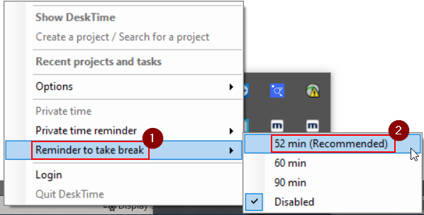 - Right click on the DeskTime icon from the system tray and hover over Reminder To Take Break.