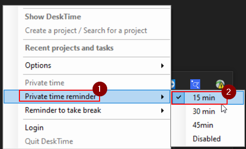 - Right click on the DeskTime icon from the system tray and hover over Private Time Reminder.