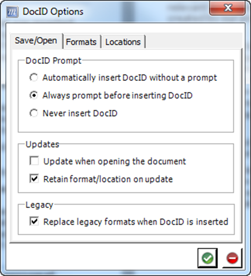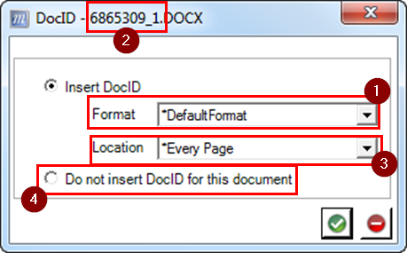 - Make your Format & Location choices, or select Do not insert DocID for this document, and click the green check mark to close the prompt.