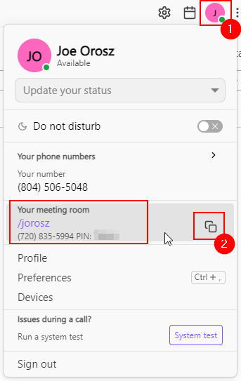 1. Within the Dialpad Desktop application, clicking the Profile Icon will show your meeting room link and phone number.