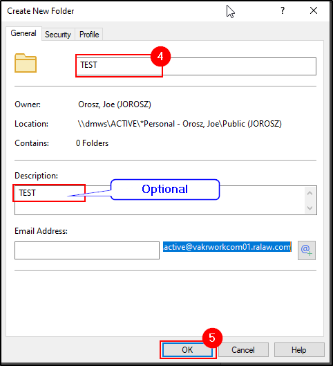 4. A window will appear. Enter in the Name of the subfolder. You can also enter in a Description (optional).