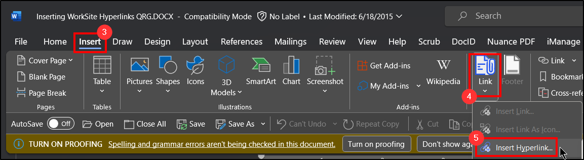 2. Place/Click the cursor where you want to insert the hyperlink, or select the text you want to hyperlink.