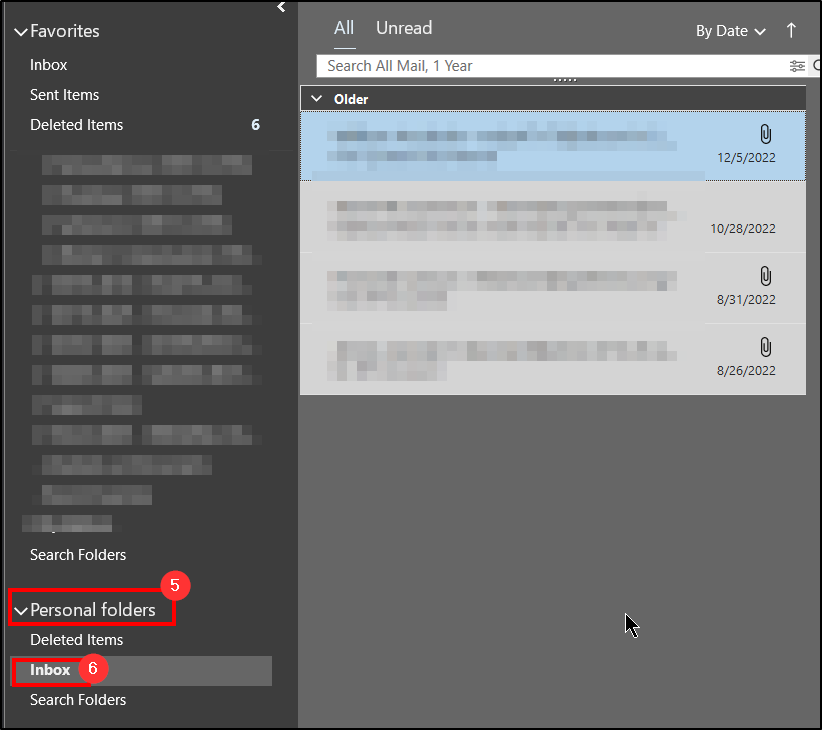 5. After opening, it will go into a email group folder called “Personal Folders”. Expand it. by clicking the arrow.