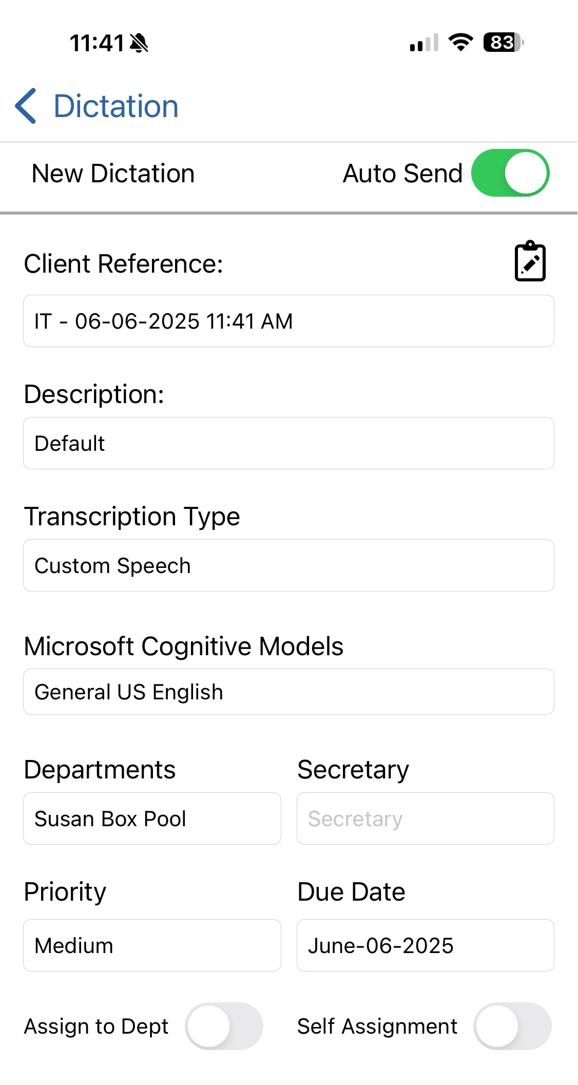 - If need to send a dication to someone not in their pool, author can choose All Legal Assistants in the Departments dropdown, then choose a specific assistant from the Secretary dropdown. *NOTE: remind author to confirm it is set back to their pool on next save/send.