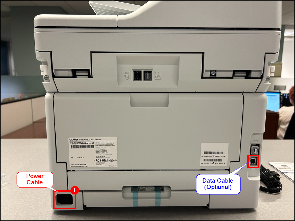 1. Plug the Power Cable into the back of the printer. If a data cable was provided, plug this into the printer and also your computer as well (optional).