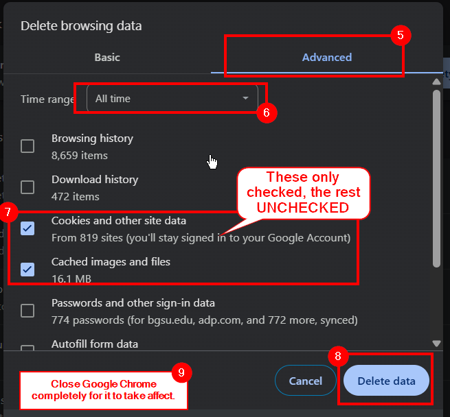 7. Only select Cookies and Cache. Unselect everything else. Scroll down to see the others that are hidden to ensure they are also unchecked.