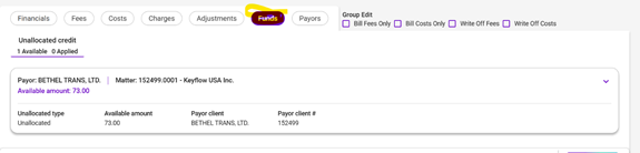 You can click on funds for unallocated. That option isn’t available for trust. Some proformas will say it has both trust and unallocated. You can only apply unallocated – trust would need requested and put into unallocated. I do not know if it says what matter the trust is on as it seems to go by client.