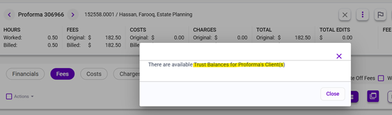 The first place it says is when you open the proforma. If there is trust it will separately say Trust balance available: