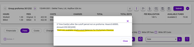 Use “Submit” to finalize a Proforma. This replaces the previous “Bill Matter” function.